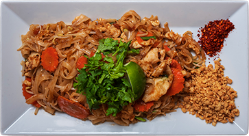 Kyckling, risnudlar, morötter, böngroddar, china leaf, ägg, koriander, lime, torkade räkor, hackade jordnötter och chiliflingor vid sidan av115;-